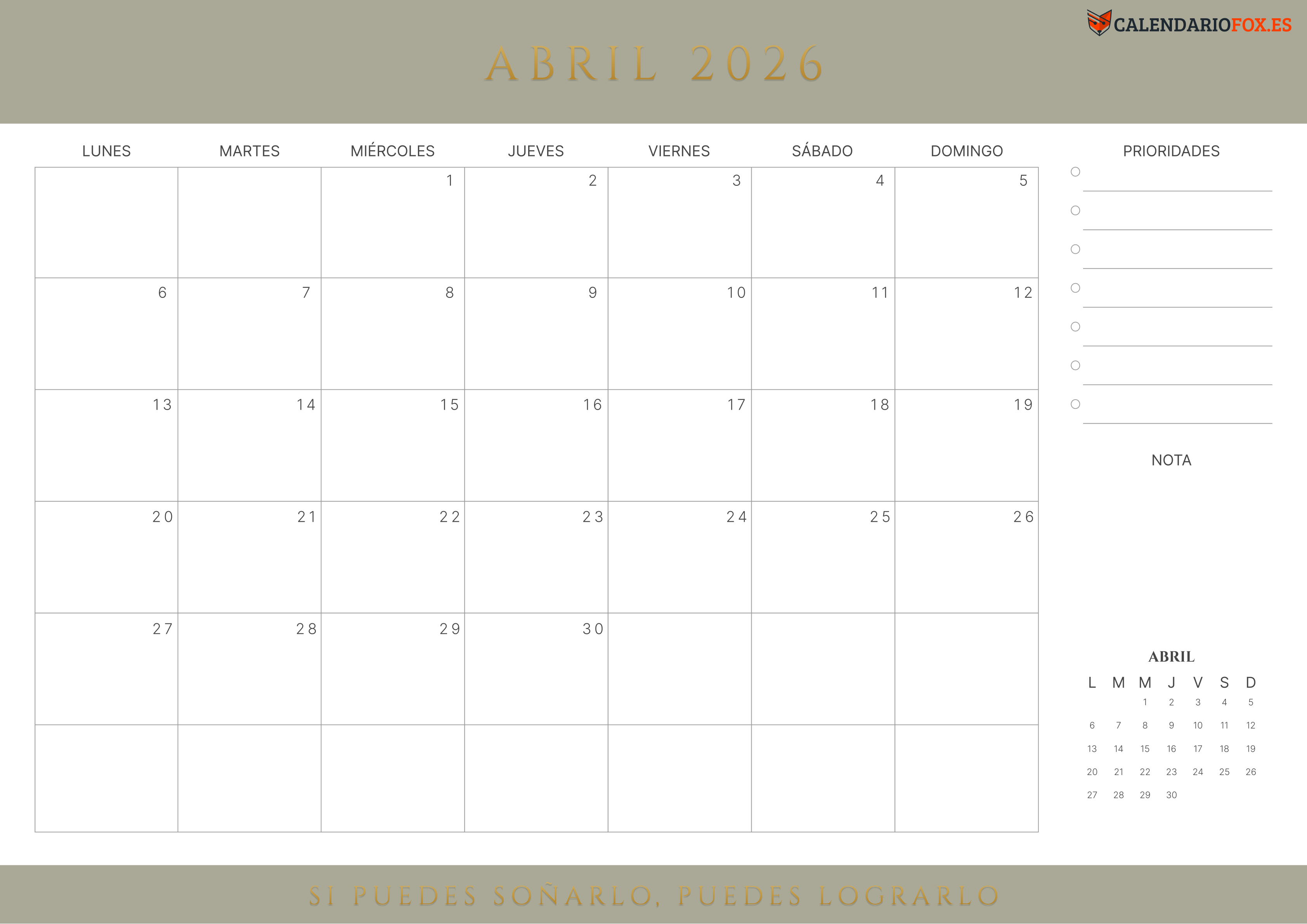 Organiza tu mes con el Calendario Abril 2026 de Calendariofox.es. Incluye festivos españoles como Año Nuevo y Epifanía, sección de hábitos, prioridades, lista de tareas y espacio para objetivos mensuales y gratitud.