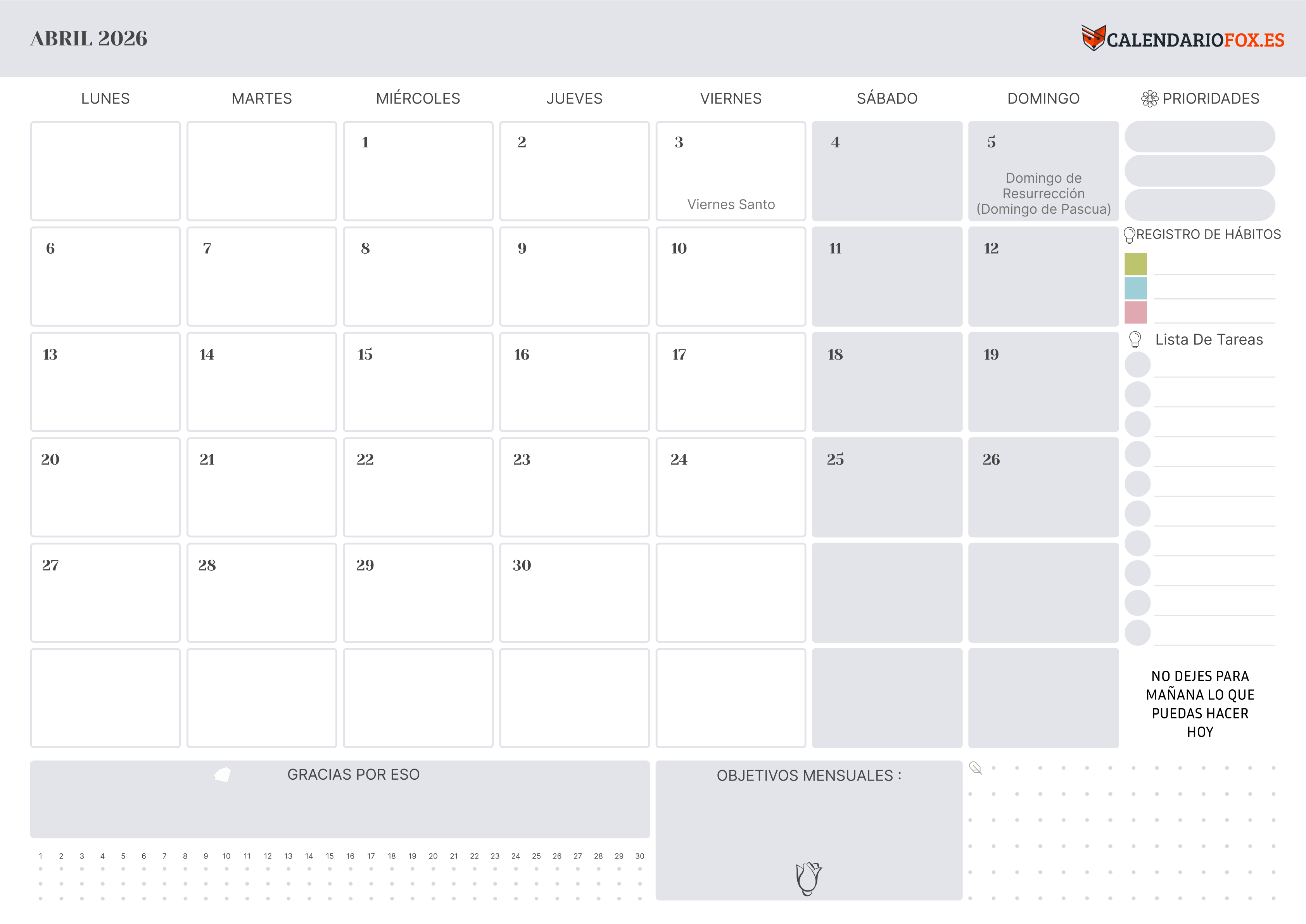 Organiza tu mes con el Calendario Abril 2026 de Calendariofox.es. Incluye festivos españoles como Año Nuevo y Epifanía, sección de hábitos, prioridades, lista de tareas y espacio para objetivos mensuales y gratitud.