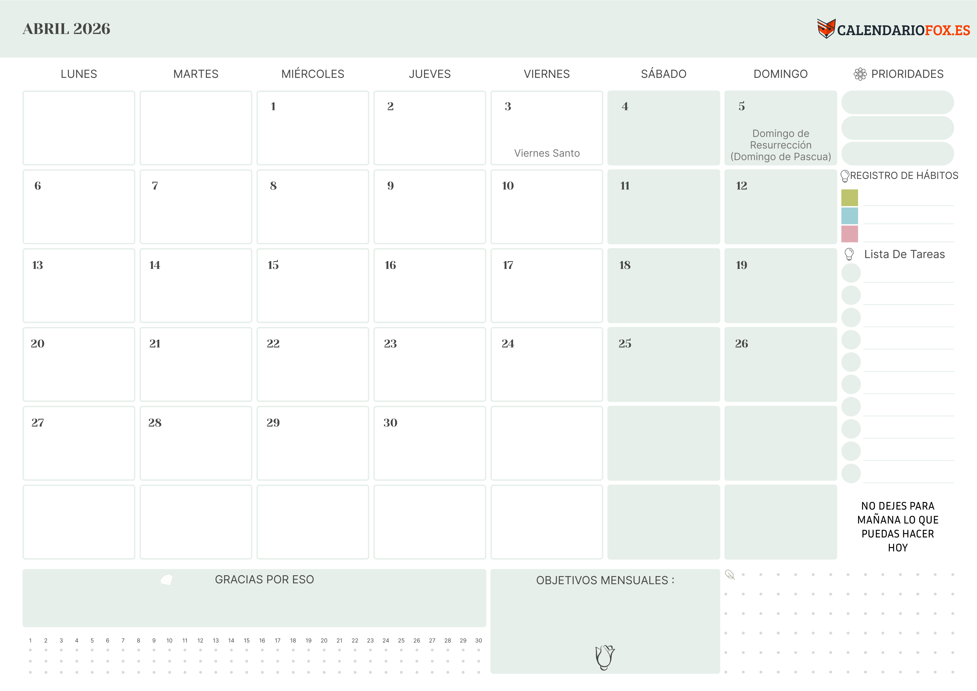 Organiza tu mes con el Calendario Abril 2026 de Calendariofox.es. Incluye festivos españoles como Año Nuevo y Epifanía, sección de hábitos, prioridades, lista de tareas y espacio para objetivos mensuales y gratitud.