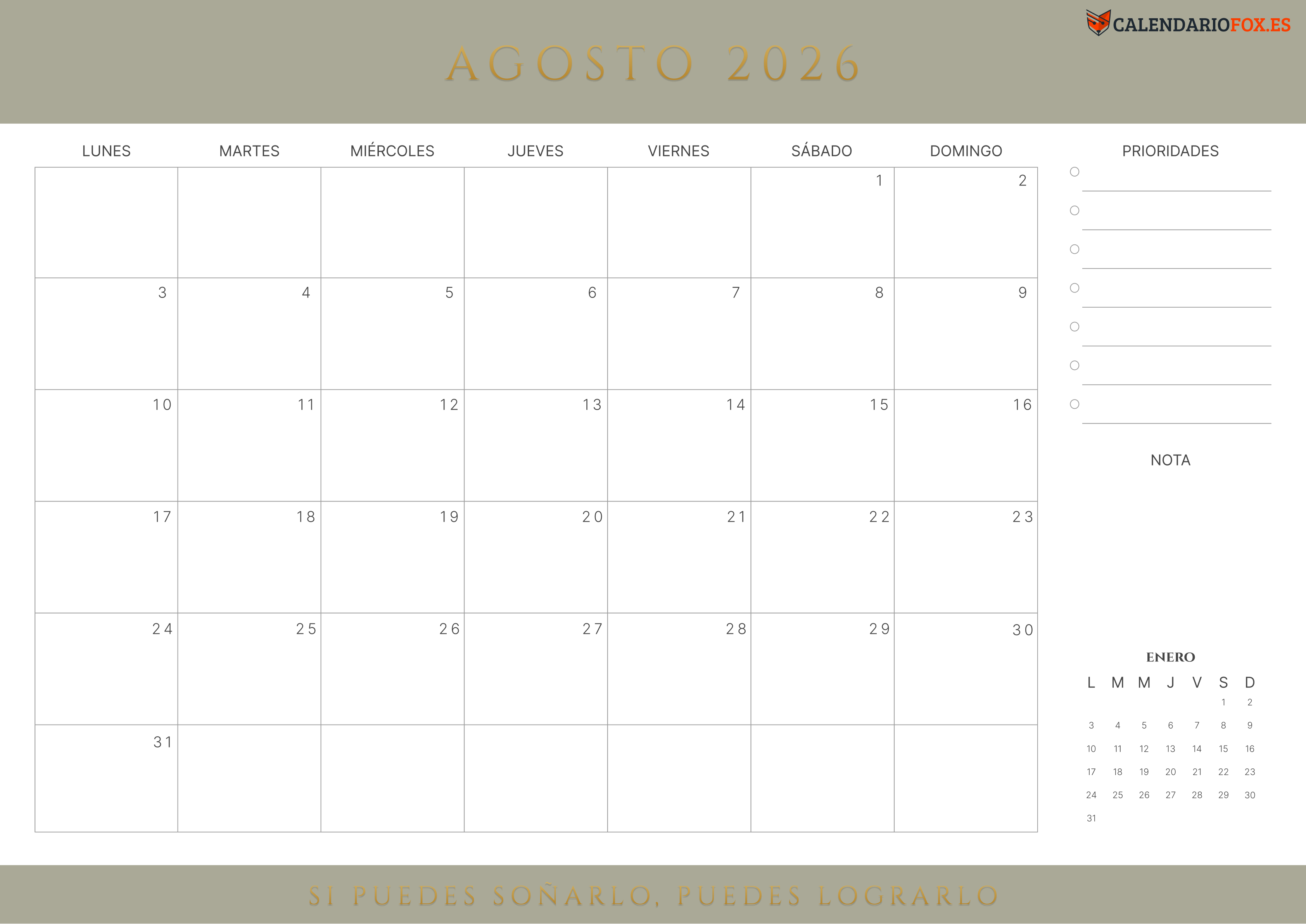 Organiza tu mes con el Calendario Agosto 2026 de Calendariofox.es. Incluye festivos españoles como Año Nuevo y Epifanía, sección de hábitos, prioridades, lista de tareas y espacio para objetivos mensuales y gratitud.