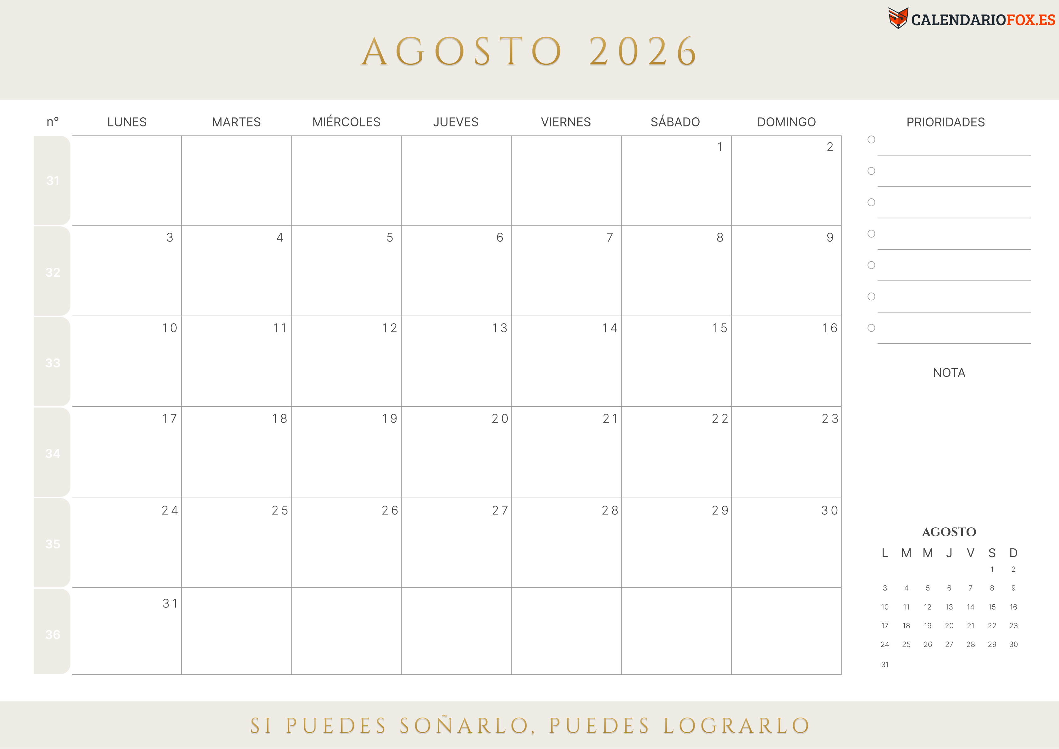 Organiza tu mes con el Calendario Agosto 2026 de Calendariofox.es. Incluye festivos españoles como Año Nuevo y Epifanía, sección de hábitos, prioridades, lista de tareas y espacio para objetivos mensuales y gratitud.