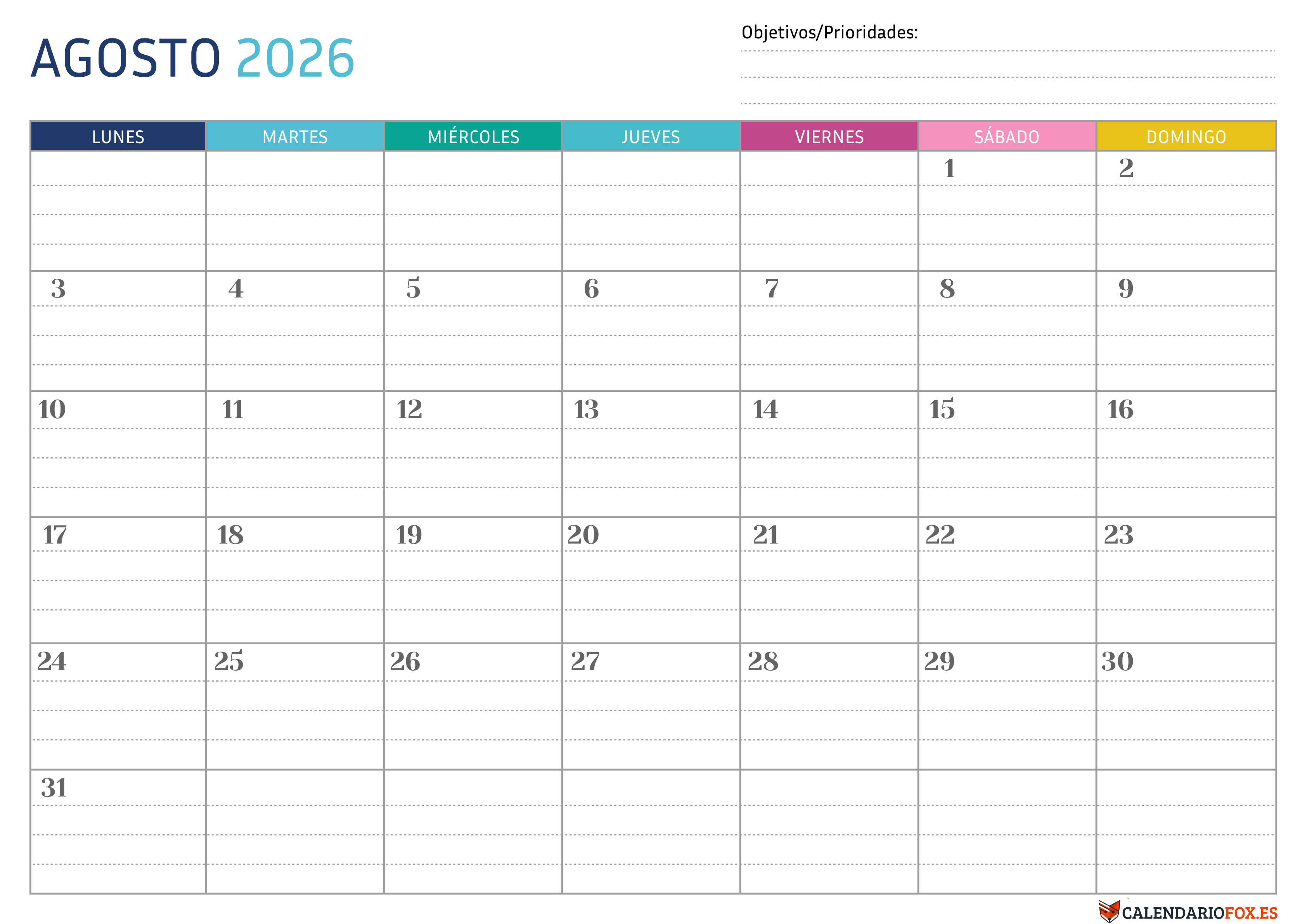 Organiza tu mes con el Calendario Agosto 2026 de Calendariofox.es. Incluye festivos españoles como Año Nuevo y Epifanía, sección de hábitos, prioridades, lista de tareas y espacio para objetivos mensuales y gratitud.