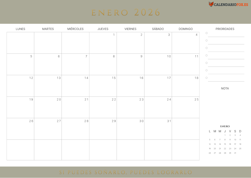 Organiza tu mes con el Calendario Enero 2026 de Calendariofox.es. Incluye festivos españoles como Año Nuevo y Epifanía, sección de hábitos, prioridades, lista de tareas y espacio para objetivos mensuales y gratitud.