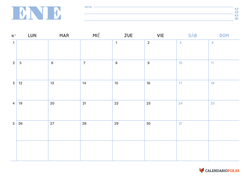 Organiza tu mes con el Calendario Enero 2026 de Calendariofox.es. Incluye festivos españoles como Año Nuevo y Epifanía, sección de hábitos, prioridades, lista de tareas y espacio para objetivos mensuales y gratitud.