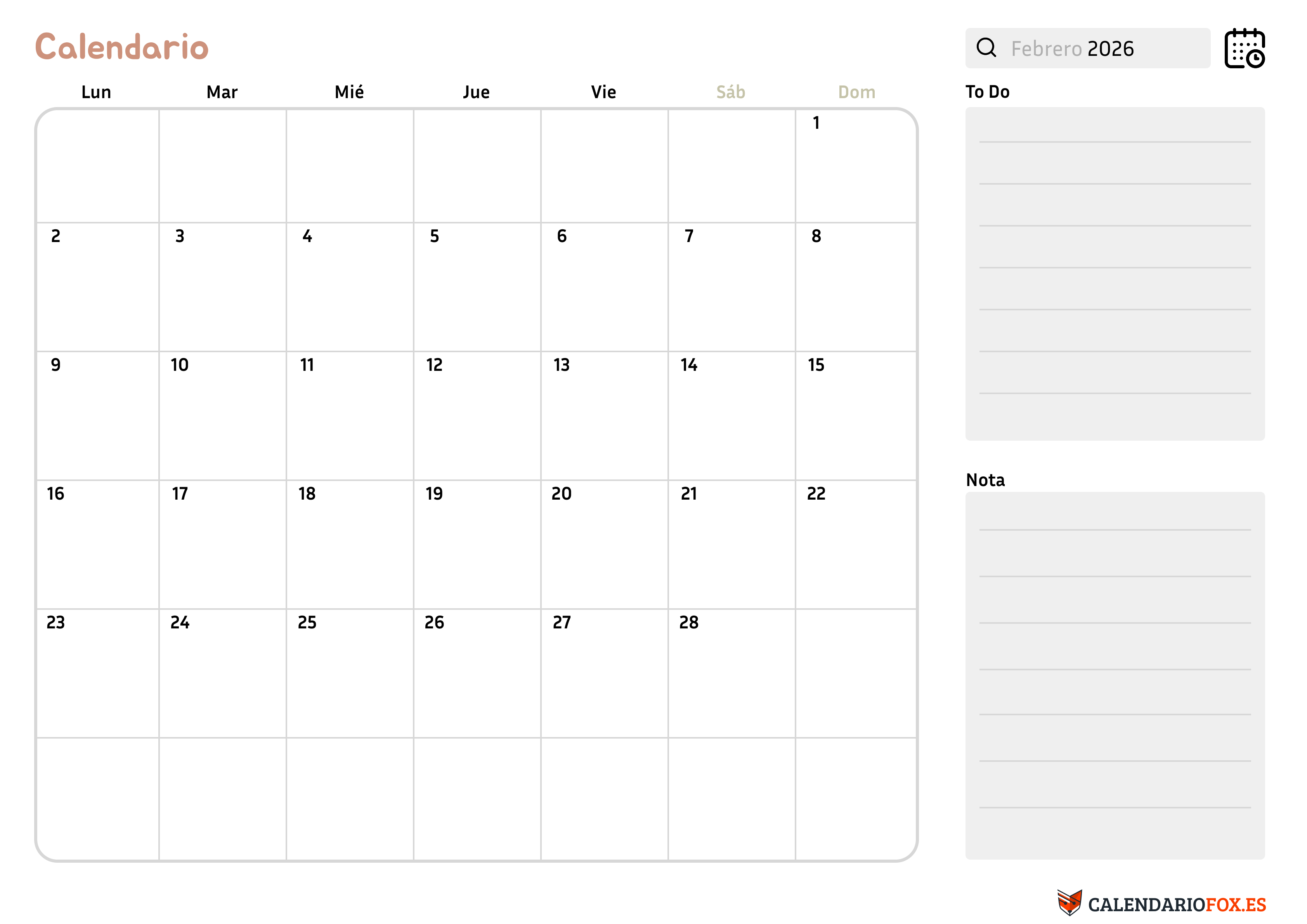 Calendario Febrero 2026 con Notas