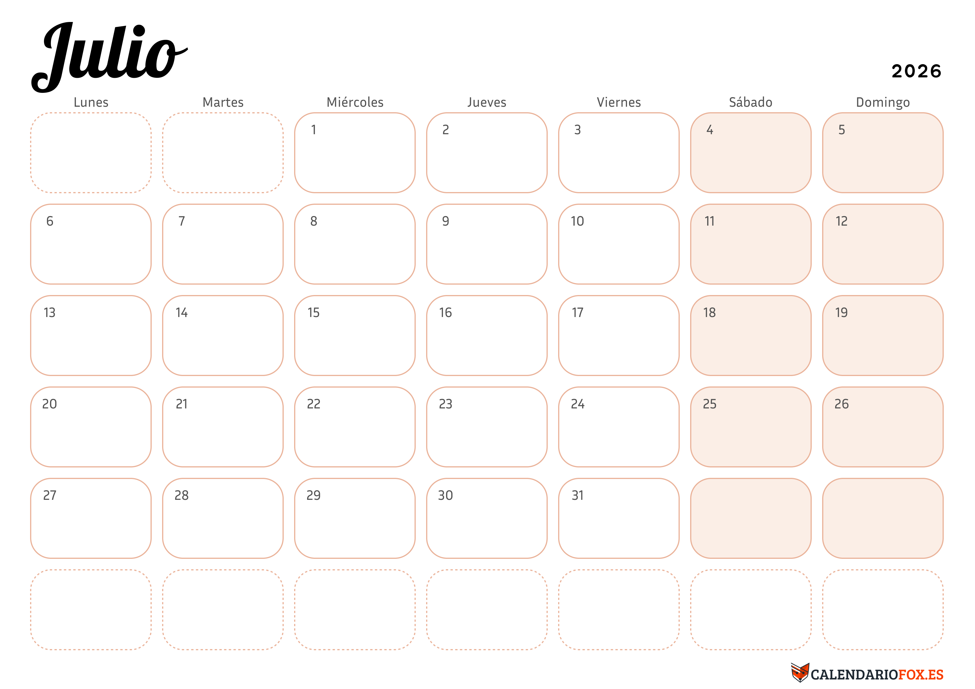 Organiza tu mes con el Calendario Julio 2026 de Calendariofox.es. Incluye festivos españoles como Año Nuevo y Epifanía, sección de hábitos, prioridades, lista de tareas y espacio para objetivos mensuales y gratitud.