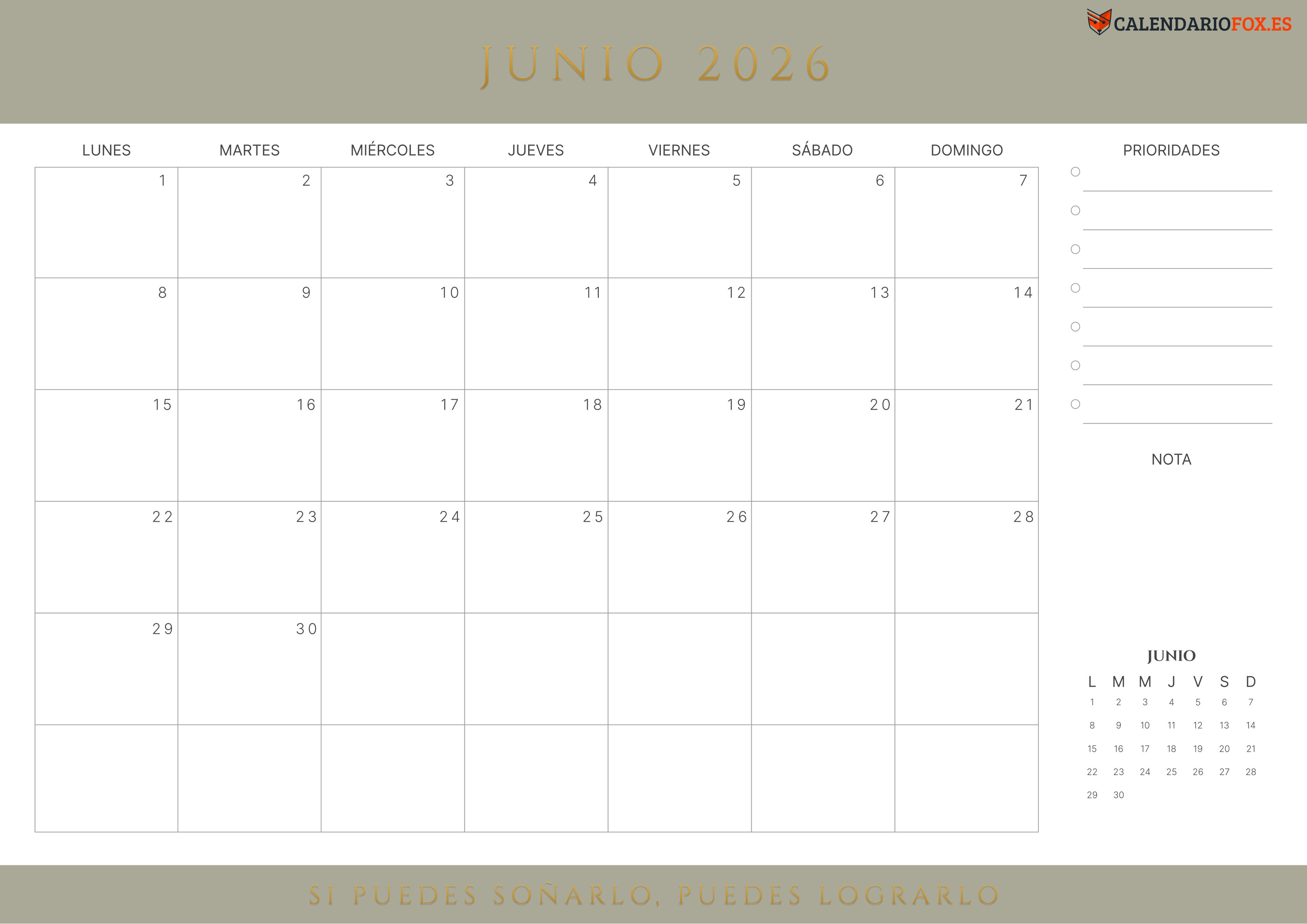 Organiza tu mes con el Calendario Junio 2026 de Calendariofox.es. Incluye festivos españoles como Año Nuevo y Epifanía, sección de hábitos, prioridades, lista de tareas y espacio para objetivos mensuales y gratitud.