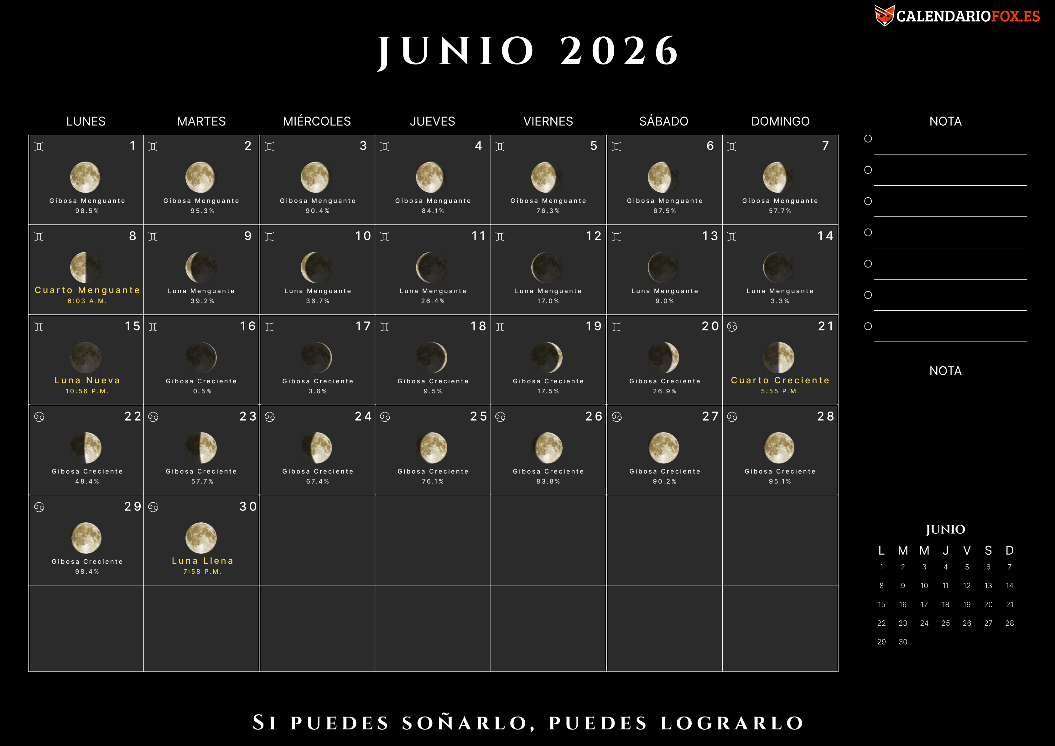 Organiza tu mes con el Calendario Junio 2026 de Calendariofox.es. Incluye festivos españoles como Año Nuevo y Epifanía, sección de hábitos, prioridades, lista de tareas y espacio para objetivos mensuales y gratitud.