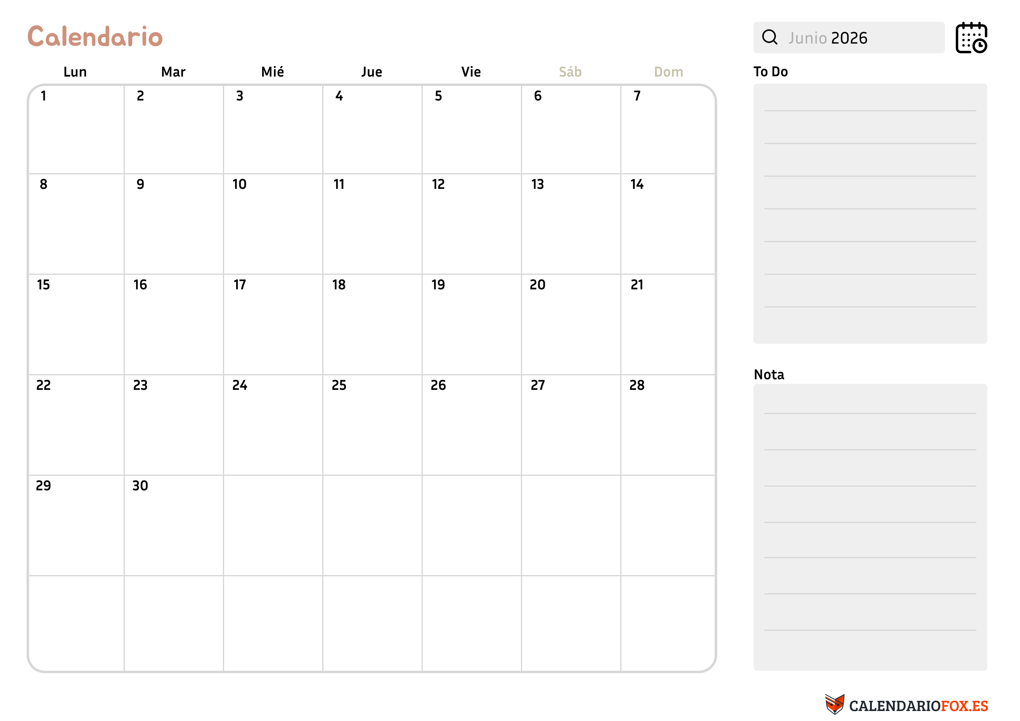 Organiza tu mes con el Calendario Junio 2026 de Calendariofox.es. Incluye festivos españoles como Año Nuevo y Epifanía, sección de hábitos, prioridades, lista de tareas y espacio para objetivos mensuales y gratitud.