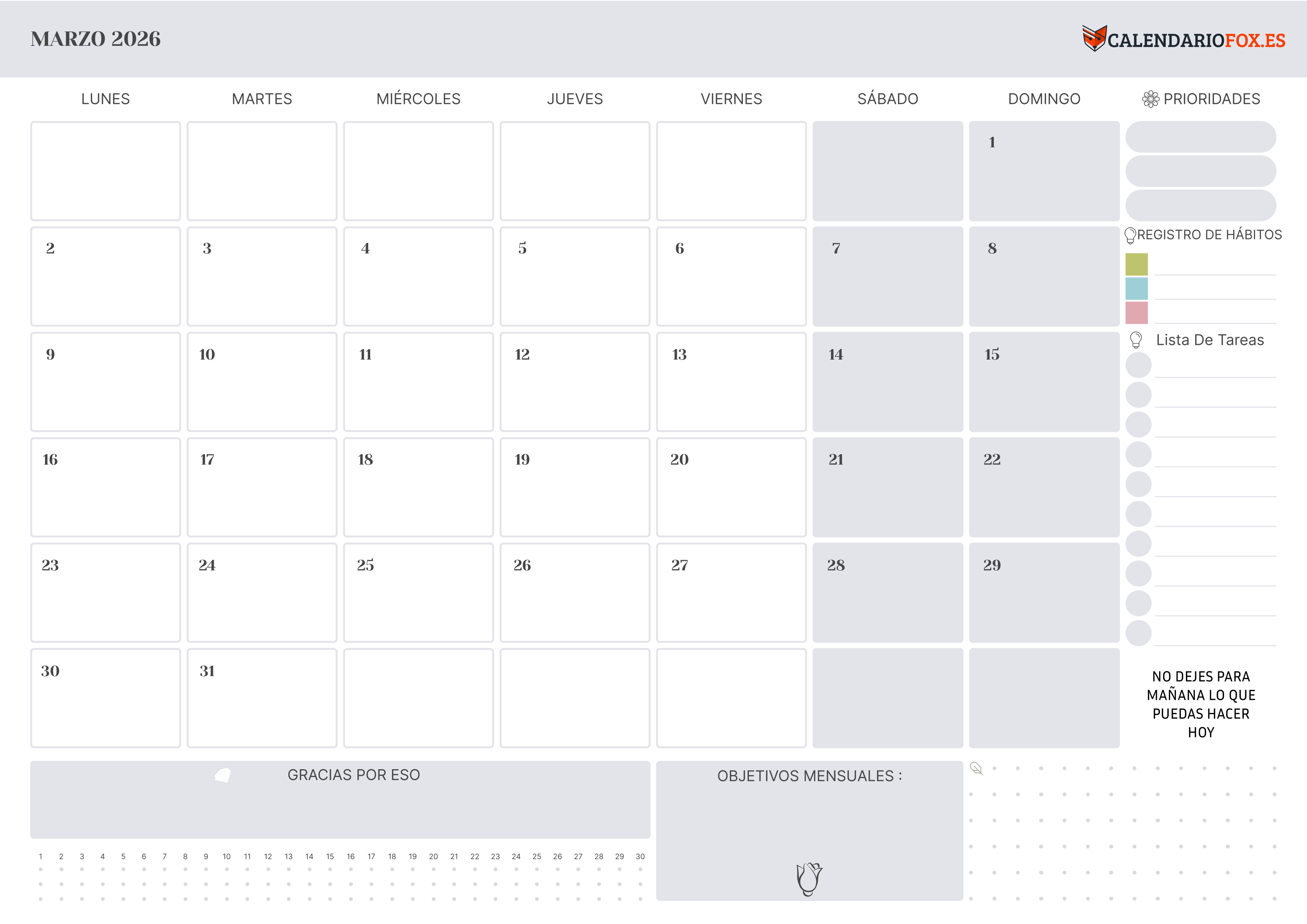 Organiza tu mes con el Calendario Marzo 2026 de Calendariofox.es. Incluye festivos españoles como Año Nuevo y Epifanía, sección de hábitos, prioridades, lista de tareas y espacio para objetivos mensuales y gratitud.