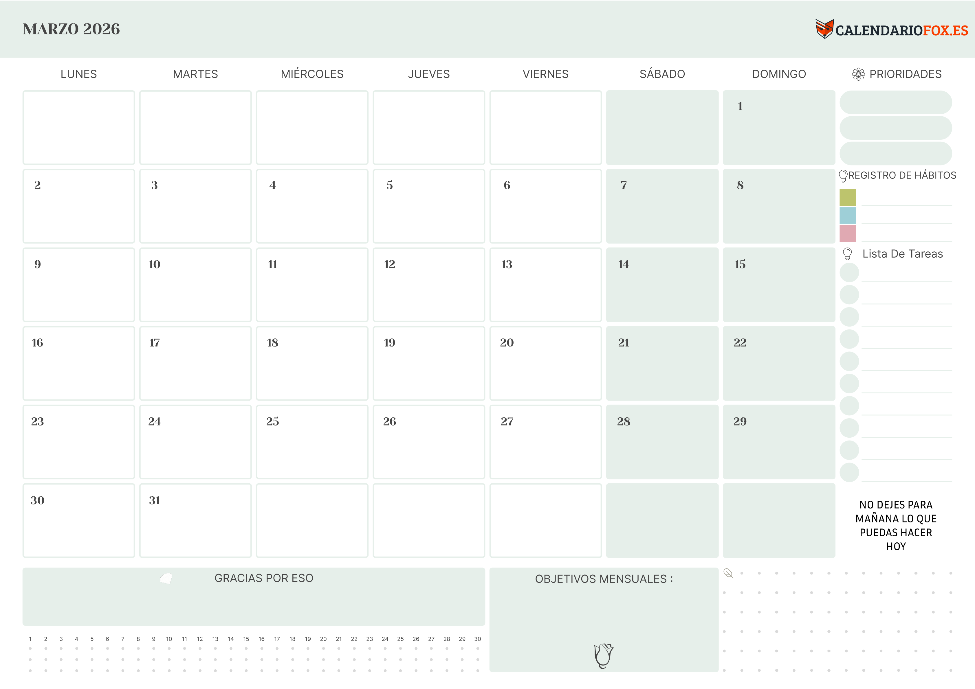 Organiza tu mes con el Calendario Marzo 2026 de Calendariofox.es. Incluye festivos españoles como Año Nuevo y Epifanía, sección de hábitos, prioridades, lista de tareas y espacio para objetivos mensuales y gratitud.