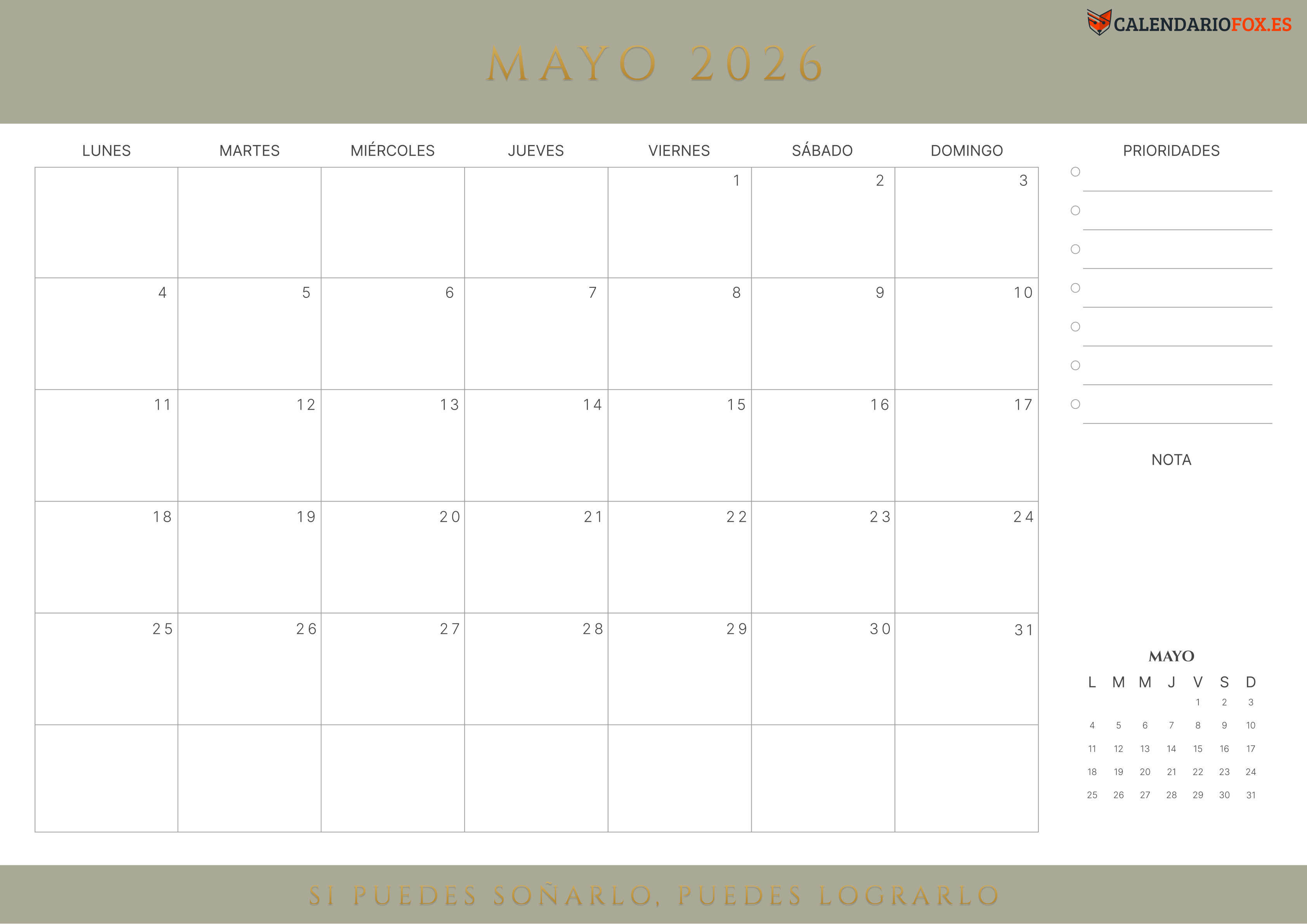 Organiza tu mes con el Calendario Mayo 2026 de Calendariofox.es. Incluye festivos españoles como Año Nuevo y Epifanía, sección de hábitos, prioridades, lista de tareas y espacio para objetivos mensuales y gratitud.