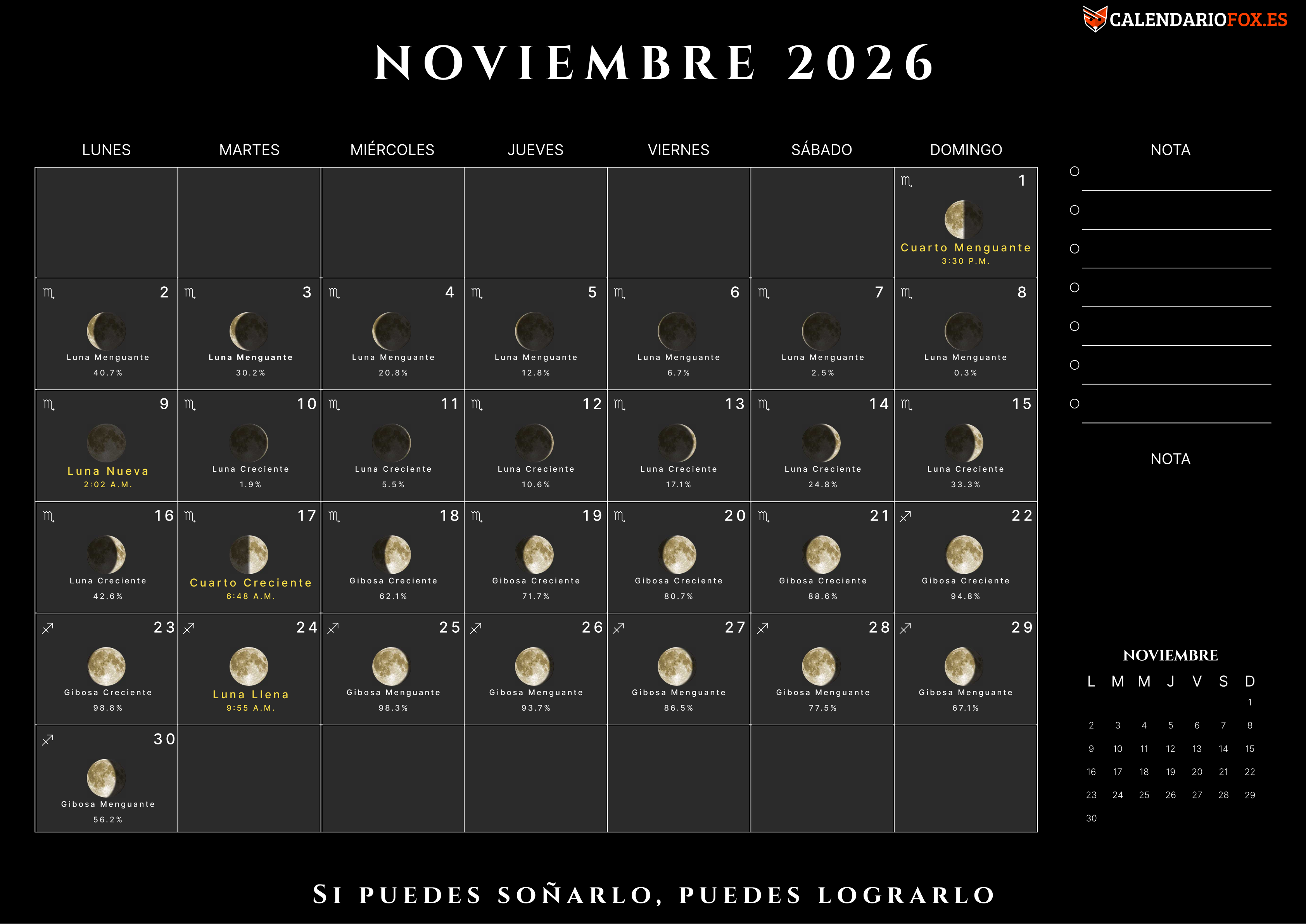Organiza tu mes con el Calendario Noviembre 2026 de Calendariofox.es. Incluye festivos españoles como Año Nuevo y Epifanía, sección de hábitos, prioridades, lista de tareas y espacio para objetivos mensuales y gratitud.