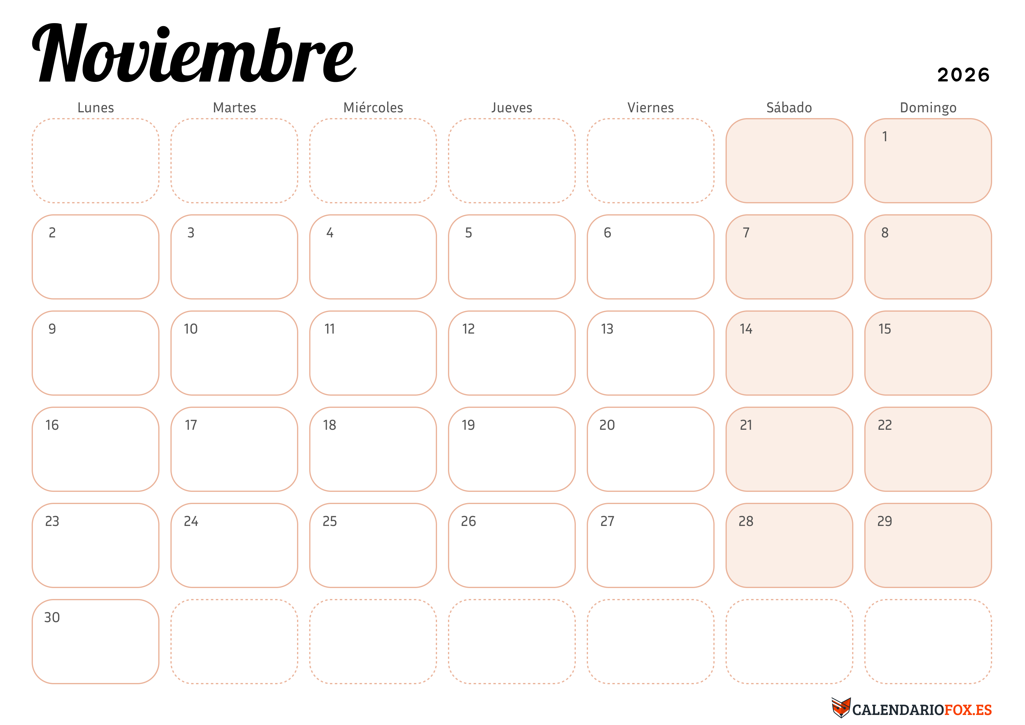 Calendario Noviembre 2026 Elegante