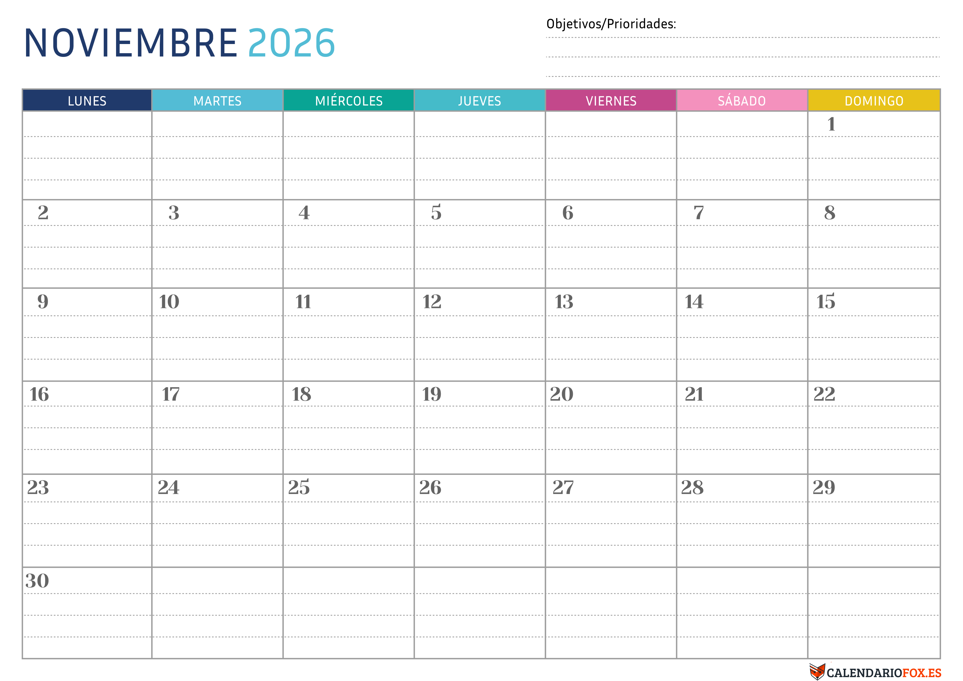 Organiza tu mes con el Calendario Noviembre 2026 de Calendariofox.es. Incluye festivos españoles como Año Nuevo y Epifanía, sección de hábitos, prioridades, lista de tareas y espacio para objetivos mensuales y gratitud.