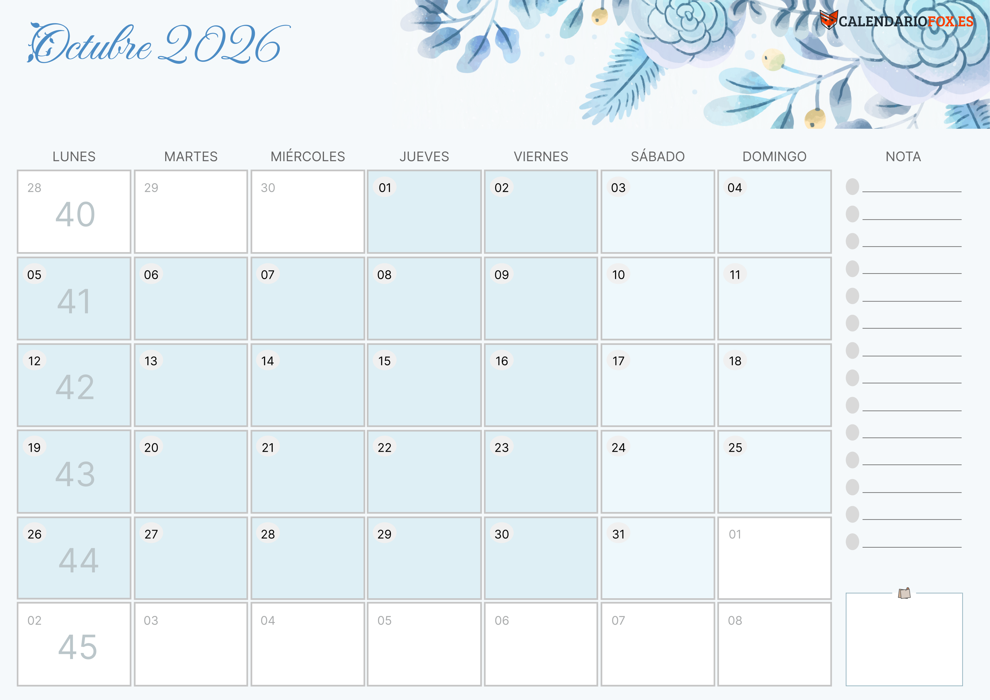 Organiza tu mes con el Calendario Octubre 2026 de Calendariofox.es. Incluye festivos españoles como Año Nuevo y Epifanía, sección de hábitos, prioridades, lista de tareas y espacio para objetivos mensuales y gratitud.