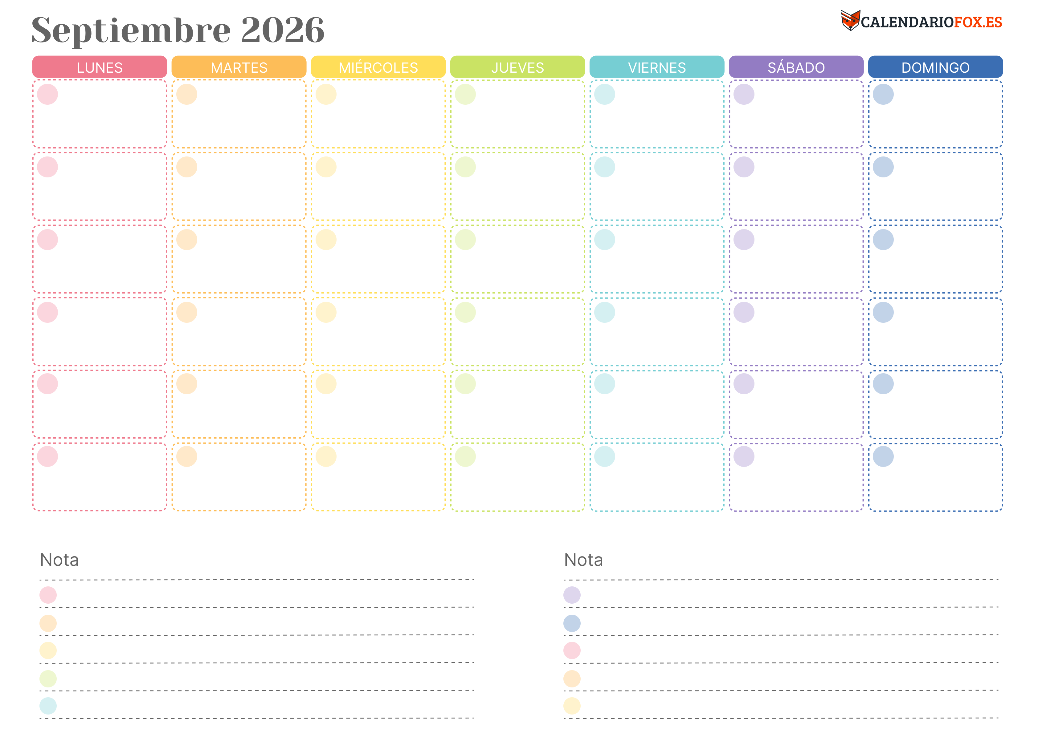 Organiza tu mes con el Calendario Septiembre 2026 de Calendariofox.es. Incluye festivos españoles como Año Nuevo y Epifanía, sección de hábitos, prioridades, lista de tareas y espacio para objetivos mensuales y gratitud.