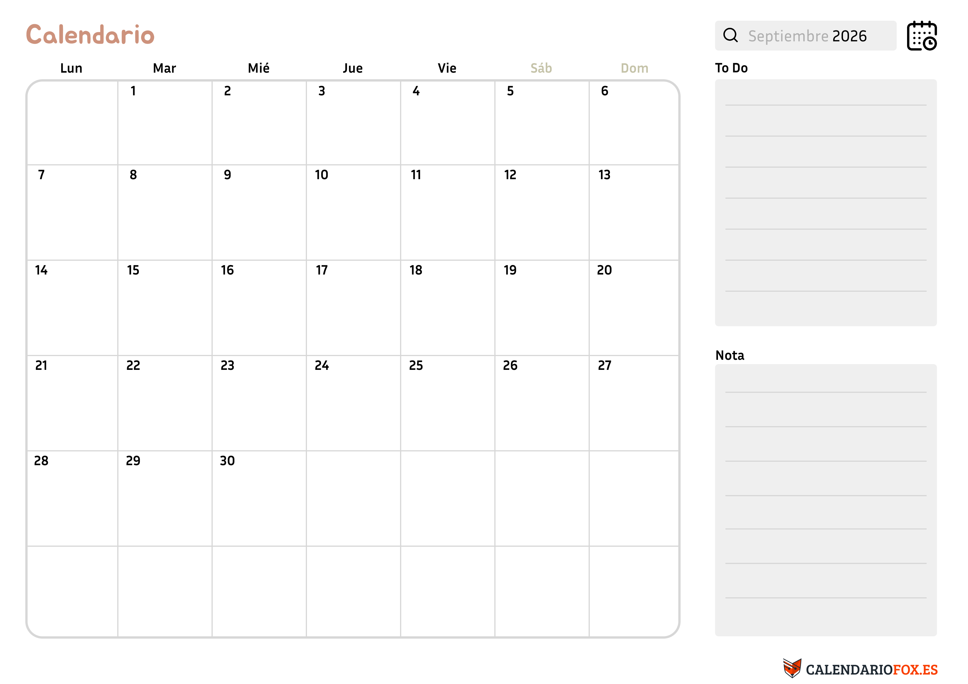 Organiza tu mes con el Calendario Septiembre 2026 de Calendariofox.es. Incluye festivos españoles como Año Nuevo y Epifanía, sección de hábitos, prioridades, lista de tareas y espacio para objetivos mensuales y gratitud.