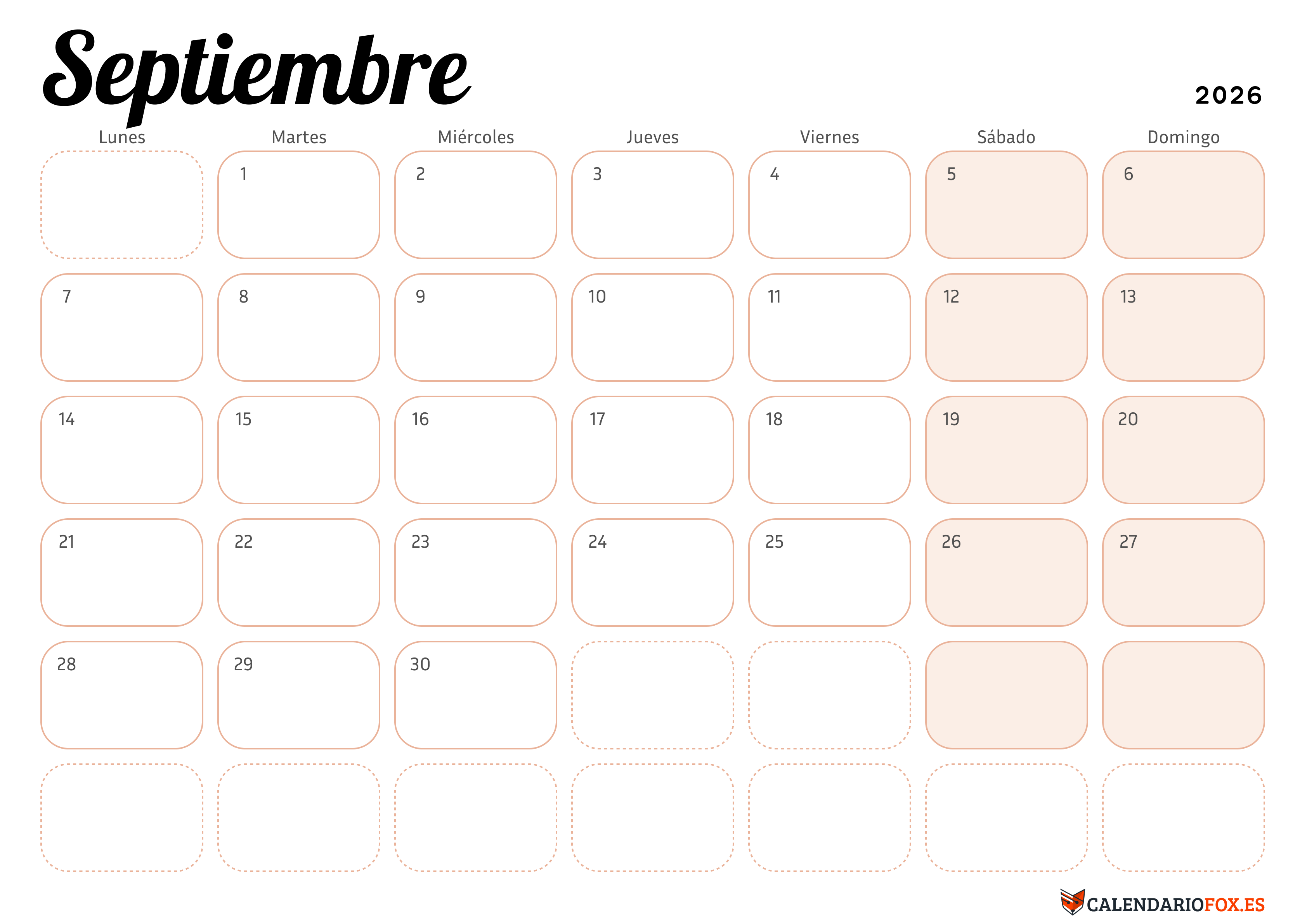 Organiza tu mes con el Calendario Septiembre 2026 de Calendariofox.es. Incluye festivos españoles como Año Nuevo y Epifanía, sección de hábitos, prioridades, lista de tareas y espacio para objetivos mensuales y gratitud.